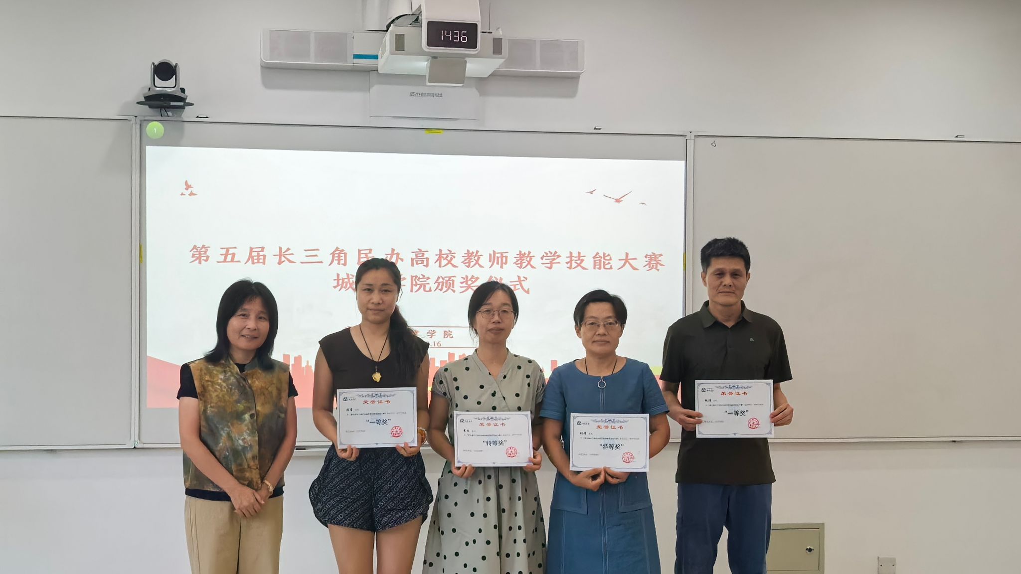 随后进入颁奖环节,金小群院长为 “第五届长三角民办高校教师教学技能大赛” 中院级获奖的胡娟、李珏、张蕾、陶涛四位教师颁奖,赞扬他们教学功底与创新理念,鼓励教师以他们为榜样,提升教学素养、提高课堂质量。