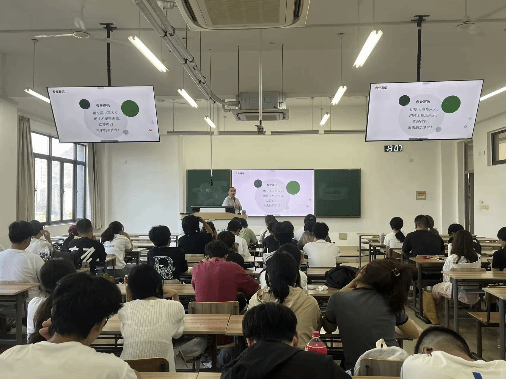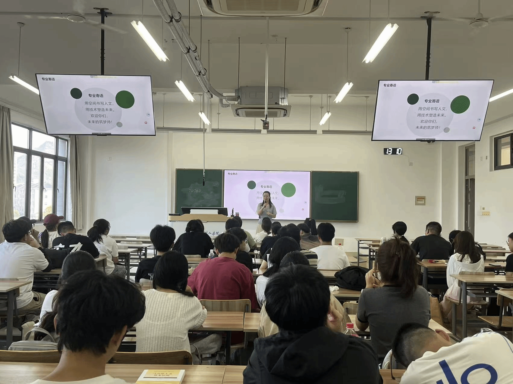 在核心讲解环节,蒋老师围绕 “什么是建筑”“建筑学培养之路”“大学五年指南”三大关键议题展开。她系统解读了建筑学的专业内涵、学科特点,清晰梳理了从基础学习到实践应用的培养路径,更针对大学五年的学习规划、能力提升、职业方向给出了具体建议,让新生对未来的专业学习有了清晰且全面的认知。最后,蒋老师以“用空间书写人文,用技术塑造未来”这句寄语收尾,既传递了建筑学的人文情怀与技术内核,也为新生注入了奋进的力量。