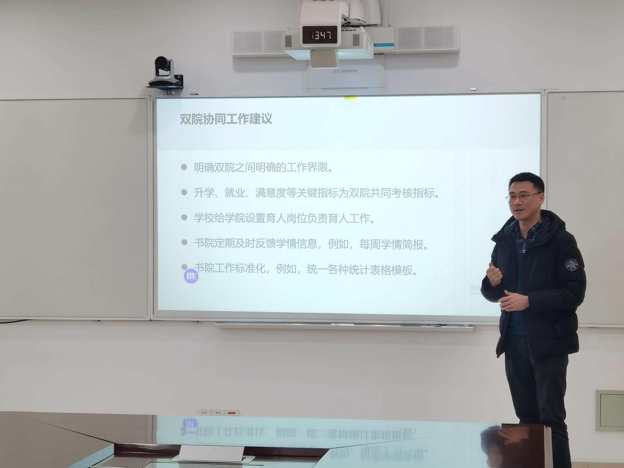学院党委副书记兼副院长王振华首先汇报了学院育人工作整体情况。他结合2025年两级目标管理考核中学生发展专项的完成情况,分析了学院的优势与短板,并介绍了2026届毕业生就业落实、考研上线及学院相关保障举措。他还从双院工作界面、考核机制、育人体系建设等方面,分析了当前存在的困难与问题,提出了优化协同机制的建议。