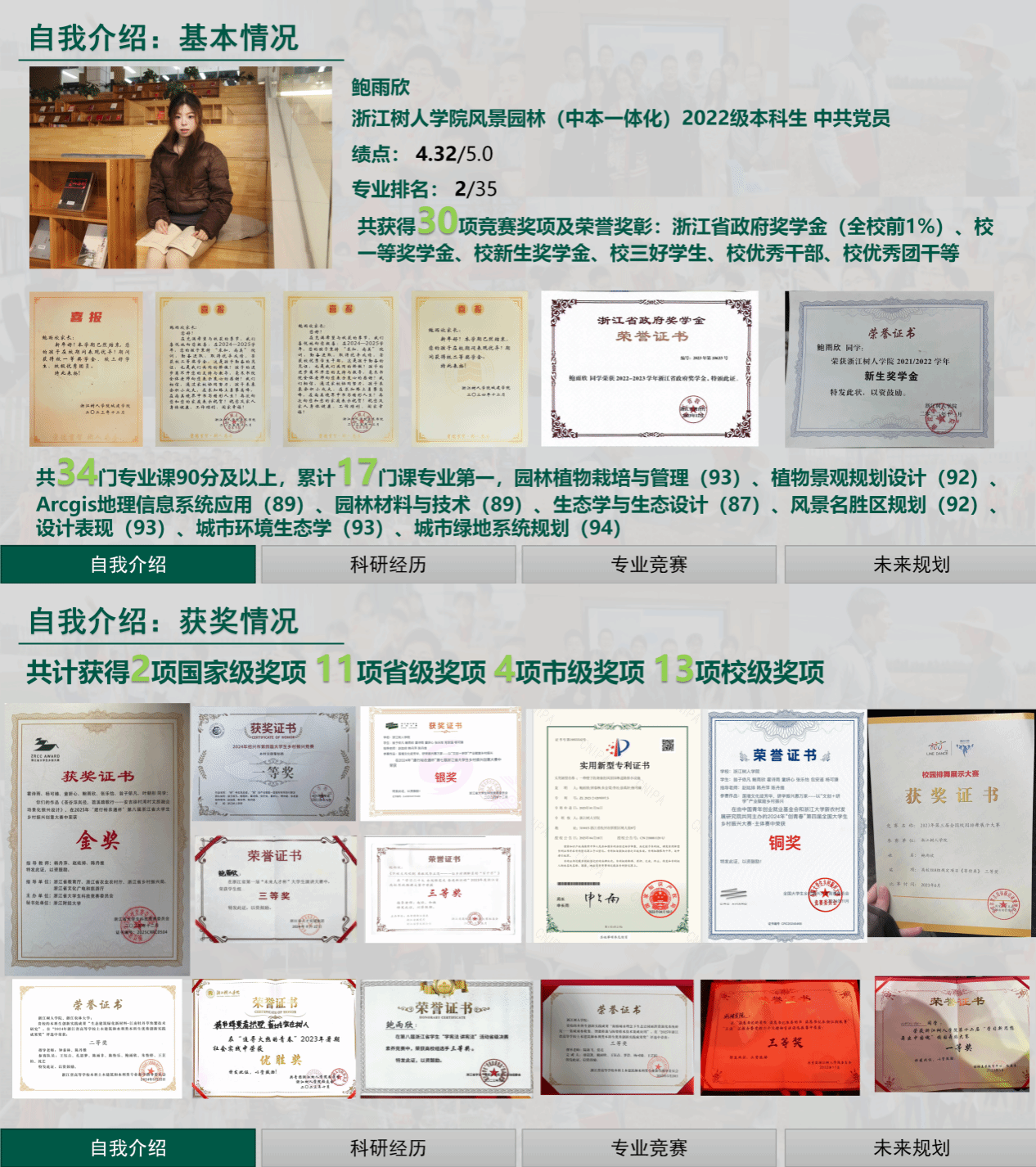 鲍雨欣入学我校风景园林专业后,不久便进入专业负责人、传宸导师钟泰林教授团队,在钟教授等老师的悉心指导与培养下,她开启了全面的“收割”模式,并于2025年光荣入党,成为一名中国共产党党员。这让她更加严于律己、勤勉学习、热爱集体。不仅在专业技能上力求精进,更注重综合素质的提升。在校期间,她综合学业表现突出,累计斩获浙江省政府奖学金、校一等奖学金等多项荣誉,获评校优秀毕业生、校三好学生、校优秀学生干部等称号。在浙江省思政微课大赛中斩获省级奖项;在浙江省第八届乡村振兴大赛中,团队荣获金奖;同时拥有 1 项国家实用新型专利授权,1项国家软著,参与的成果获浙江省土木建筑和水利类专业本科生优秀创新实践成果奖二等奖。此外,她还在多项国家级、省级学科竞赛中屡获佳绩,累计获得 30余项竞赛奖项与荣誉表彰。